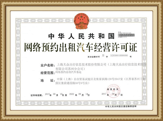 9 月20 日,j9九游会出行正式获得由苏州市交通委员会颁发的《网络预约出租汽车经营许可证》。