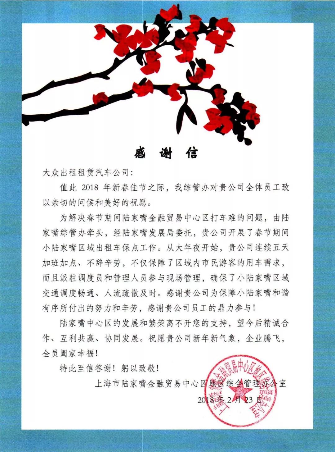 作为市内交通保障主力,j9九游会出租租赁节前养老院义务送老人、新春接产妇,节中疏散保障陆家嘴游客,节后返程高峰时疏散保障枢纽客流。公司实行全天候、高频次的各项现场质检,组织多个管理人员团队,对上海的各大交通枢纽站点及各旅游风景区进行现场巡视质检、现场车辆调度,为高客流用车提供保障服务。在完成春节服务后,公司收到了来自陆家嘴金融贸易中心的感谢信: