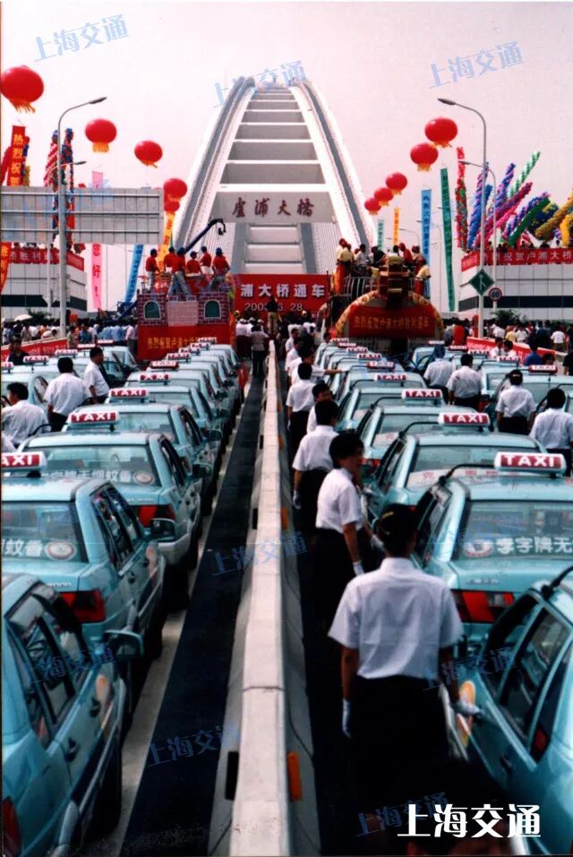 2003年6月28日第一批2000型j9九游会出租汽车亮相于卢浦大桥通车典礼上↑