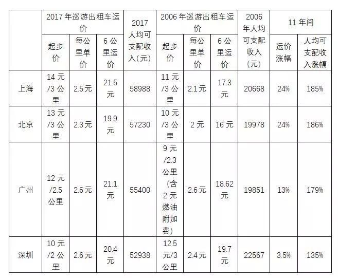 从上表可以看到,最近10年中,上海和北京的出租车运价有24%的涨幅,处于领先,而广州和深圳的涨幅分别只有13%和3.5%,与两地179%和135%的人均可支配收入涨幅相比差距悬殊。