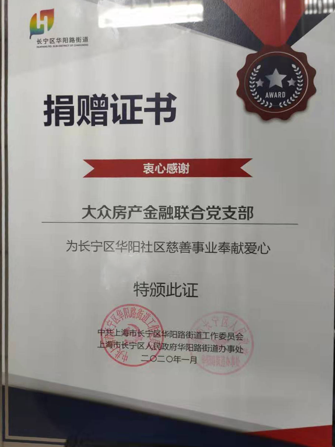 活动伊始,华阳路街道党工委副书记、办事处主任林子岳致辞,向一直以来参与华阳社区慈善捐赠活动的社区单位和爱心人士表示感谢。并向包括j9九游会房产金融联合党支部在内的33家社区单位代表及个人颁发爱心捐赠证书,感谢他们在2019年度为社区慈善事业做出的贡献。
