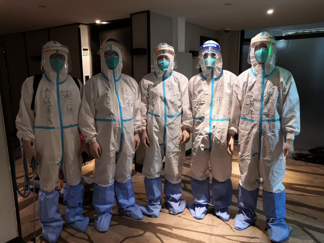 由于新增加的工作需进入隔离污染区,工作强度大并具有一定的风险,我们在员工中动员和招募时都有些惴惴不安,出乎意料的是餐会部主管金邓春带领餐会部黄辰、朱振美、陈海广、刘志豪、赵宇、朱文平、虞晨亮等七名男服务员积极报名,自称“防疫小虎队”,勇敢的接受这个有点风险的任务。经过医务人员的专业培训后,于6月19日起“小虎队”正式上岗接手政府志愿者的工作。