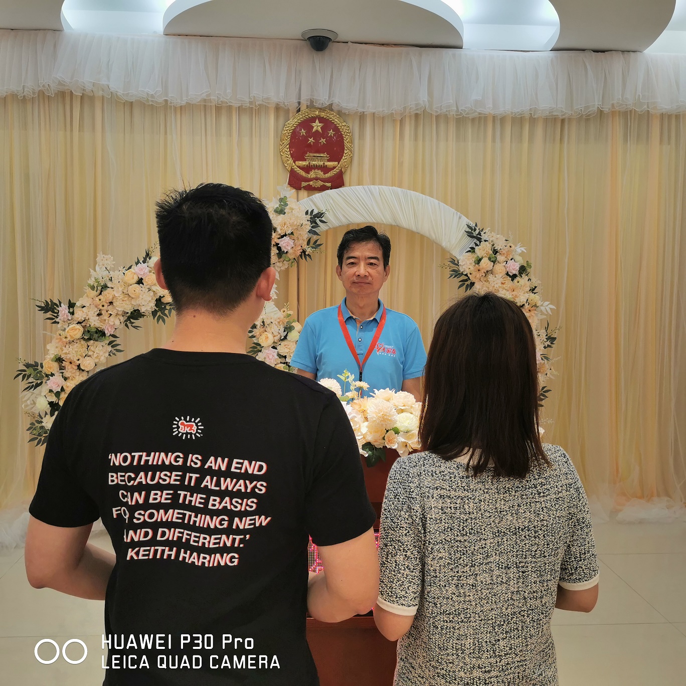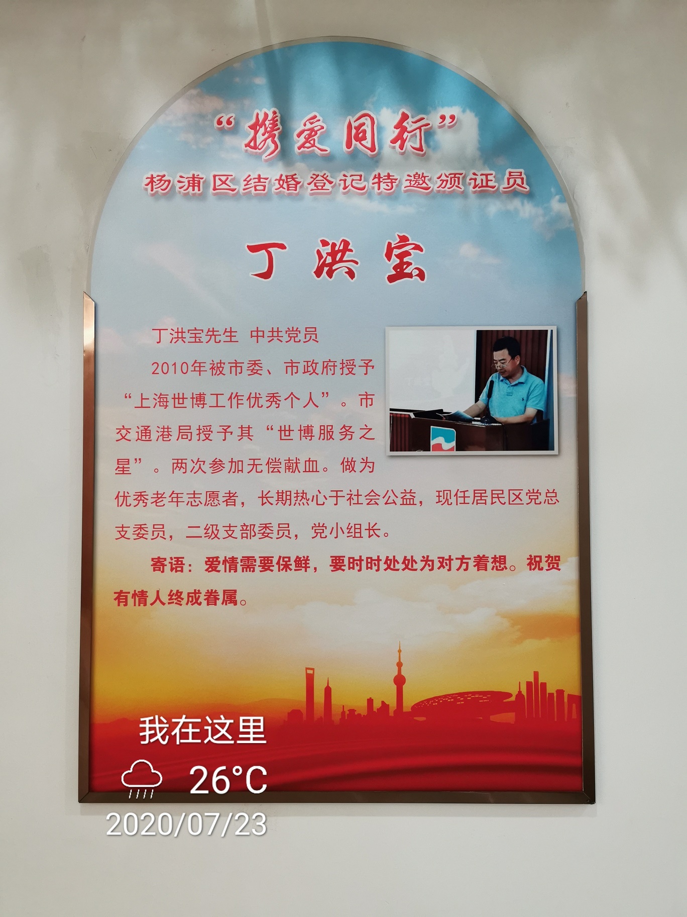 7月23日,这一天是一个很平常的日子。但是对于上海这座城市和我而言又是一个不平常的日子。99年前的这一天,中国共产党第一次全国代表大会在上海召开。这一天也是我作为特邀办证员志愿者培训后第一天上岗的日子,心里既高兴又兴奋。与充满朝气,阳光的青年男女在一起特别高兴。感到自己又年青了许多,仿佛自己又回到了上世纪70年代末80年代初,在车间党支部领导下,带领团支部里30多个团员青年一起工作的日子。这一天,我很高兴地为5对新人颁发《结婚证》,见证了他们一生中最幸福的高光时刻,我给他们的寄语是:爱要大声说出来,从今往后经营好你们共同的爱情、婚姻、家庭向幸福出发。同时向他们传递了我们中老年人生活中积极向上和向善的力量,我感觉自己这一天过得特别有意义。